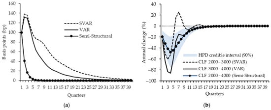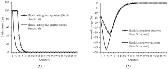 Impulse–response functions (shock lasting four quarters): (a) response of mortgage rate to a 100-basis-point shock to the mortgage rate; (b) Response of housing demand to a 100-basis-point mortgage rate shock lasting four quarters.