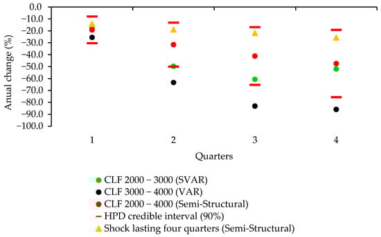 Regarding the impulse–response functions depicted in Figure 6 and considering an extended analysis horizon, the semi-structural quantitative model, characterized by its forward-looking nature through the incorporation of expectations of the future trajectory of the mortgage rate, predicts that a standard innovation that increases the mortgage rate by 100 basis points relative to its equilibrium level results in an immediate annual decline of 19.2% in real estate sales during the period in which the shock occurs. Subsequently, this effect intensifies, culminating in a cumulative decrease of approximately 47.5% by the end of the first year. The HPD credible interval, derived from Bayesian inference, encompasses the impulse–response functions obtained from alternative models such as the Structural Vector Autoregressive (SVAR) model and conventional VAR. In contrast to the semi-structural approach, these models employ a backward-looking structure, primarily based on the historical dynamics of the mortgage rate, without explicitly considering the expectation channel, which partially accounts for the observed differences in the magnitude and persistence of the responses.