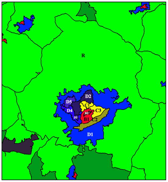 Specifically for the case study, with reference to the territorial configuration outlined by the existing OMI in the first half of 2024, the municipal territory of the city of Potenza extends over four OMI bands (Figure 1: central, semi-central, peripheral, extra-urban) which are in turn divided respectively into 2 central zones (B1, B2), 3 semi-central zones (C1, C2, C3), 5 peripheral zones (D1, D2, D3, D4, D5) as well as one extra-urban zone (R), as shown in Figure 2.
