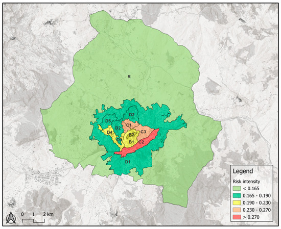 Once the specific weights for each indicator k and for each criterion j have been determined through the Analytic Hierarchy Process (AHP), we proceed with the determination of the composite risk index—for each OMI zone of the municipality of Potenza—using formula number 3 reported in Section 3.4, capable of methodically combining all risk indicators (Table 14).