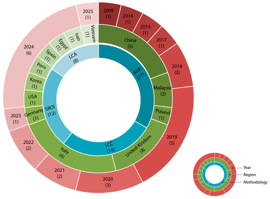This trend reflects a certain fragmentation in the evaluation approach, which may compromise the effectiveness of analyses in representing the complexity of sustainability-related phenomena. At the same time, this evidence opens up a relevant space for future research, which could move toward the definition of integrated methodological frameworks capable of combining tools such as AHP, LCC, LCA, and SROI, thus fostering more holistic, transparent, and systemic sustainability-oriented decision-making processes, as will be discussed in the next sections of this work.