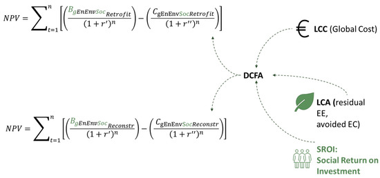 According to the first address, a methodological approach is illustrated, implying the use of the life cycle approaches for economic and environmental evaluation, through Life Cycle Costing (LCC) as formalized in ISO 15686-5:2017 [7], and Life Cycle Assessment (LCA) as formalized in ISO 14040:2021 [8], respectively. Besides, the Social Return on Investment (SROI) is aimed at monetizing the social impacts generated by interventions, as formalized in the guidelines and manuals edited by the Roberts Enterprise Development Fund and Human Foundation. Operatively, aiming at introducing a holistic perspective in the investment analysis, the conventional Discounted Cash-flow Analysis (DCFA)—and the related Net Present Value (NPV) indicator—well established for evaluating project financial feasibility, is enriched by internalizing environmental and social components. The global cost and the «global benefit» as reformulated in previous studies from a life cycle perspective [3,9], are furtherly revised in this work by internalizing the social value components in the NPV synthetic indicator (comparative) calculation.