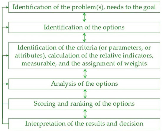 In premises, the concept of evaluation is conceived as a process applied simultaneously to a finite number of alternatives, of a cyclical and retroactive nature, strictly dependent on the problems addressed, on time, on the organizational context of reference, and on knowledge. The logical steps of the decision process are summarized in the following Figure 3, in which: step 1 consists of identifying the objective of the analysis, which is to obtain the preferability ranking among design alternatives; step 2 is intended for the identification/selection of alternatives with the support of a set of criteria identified in step 3, which provides for the attribution of weights to the criteria; step 4 provides for the application of the analysis, the production of results, and the final decision.