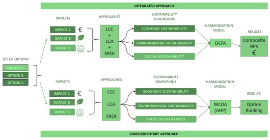 In other words, the logical path summarized in Figure 4, where a distinction is made between an integrated approach and a complementary approach, is nothing other than the basis for further “application schemes” based on appropriate alternations of analysis, the logical sequence of which is defined according to the object of the evaluation, the available data, and the actors involved.