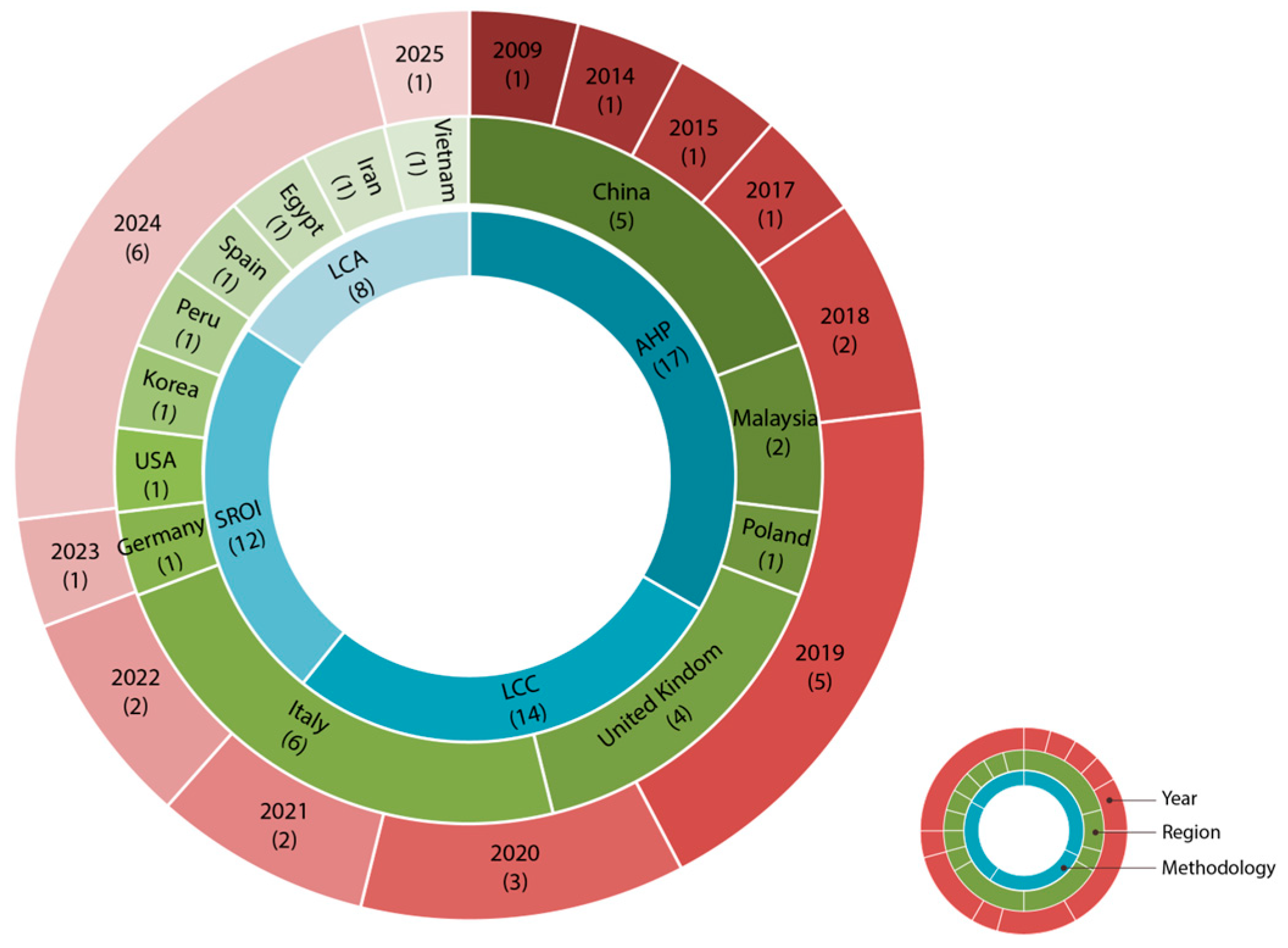 Table 1, the most frequently adopted combination is AHP–LCC (13 articles), followed by AHP–SROI (3 articles) and SROI–LCC (1 article). Specifically, AHP is used in studies ranging from the evaluation of urban infrastructure to waste management and rural development, suggesting its flexibility in supporting decision-making processes. LCA and LCC are often used together, particularly in the building and industrial sectors, reflecting growing attention to the environmental and economic dimensions of sustainability. The SROI approach stands out for its contribution to assessing social impact, especially in contexts such as social enterprises, cultural organizations, and urban area development.