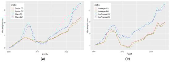 For both indices, adjustments have been made to the methodology and construction, which may impact their time series; however, we do not find, on average, any significant differences in the time series. When CoreLogic acquired the S&P/Case–Shiller indices in late 2013, it integrated its more extensive database into the national housing market index in 2014, resulting in a smoother series around market tops and bottoms [19]. CoreLogic also announced revisions made effective with the February 2025 release of December 2024 data to reduce the impact of outliers, update the weighting approach, improve the seasonal adjustment models, and enhance the geographic coverage and data granularity; however, these changes do not impact our analysis.