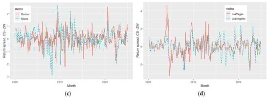 Local city markets show both common and city-specific variation. Figure 2a–d compare four cities for illustrative purposes. In the first case, Miami and Boston exhibit distinct price patterns, with Miami displaying strong price appreciation and notable divergences between HPIs. In the case of Boston, price appreciation is muted with smaller HPI return differentials. A comparison between Las Vegas and Los Angeles reveals that both cities experienced significant housing price appreciation following the market boom and bust that occurred during the Great Financial Crisis. The monthly return spread difference displays the variation in returns which are likely centered around macroeconomic events and potential local transaction congestion.