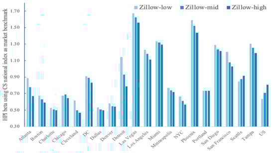 Localized real estate market factors create regional differences and impact spreads between transaction and hedonic indices. To display localized housing market differences, city housing betas are calculated based on the Case–Shiller National HPI, serving as the market portfolio due to its role as a standard index. There is a wide range of housing betas, with lower-tier homes showing higher levels. Cities such as Las Vegas, Phoenix, and Tampa SMSAs, which have seen significant population increases, show higher betas, (see Figure 3). These beta variations reinforce the observation that city-specific HPIs show greater variation than national data and may be more sensitive to economic variation and local market conditions.