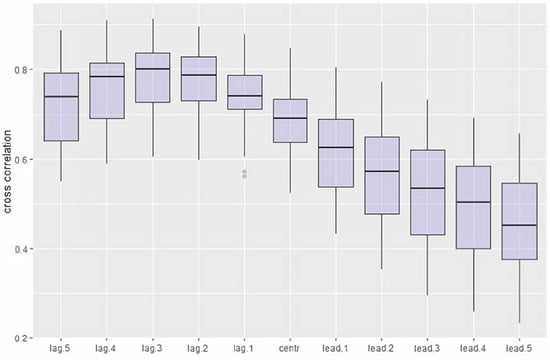 Both HPIs show strong positive autocorrelation with slow decay. Given the CS HPI construction as a moving average, this should be expected. The same effect is also present with the hedonic index, which uses transactional prices as a characteristic input. Housing shows strong momentum effects across all cities; however, using the augmented Dickey–Fuller test, all city HPIs are stationary at p-values below 0.01 when differenced. To show the link between the HPIs, we measured the cross-correlation between the CS city and Zillow city indices across tiers. Figure 4 displays the boxplots for different lead-lag times for the set of cities and tiers for the two HPIs, showing that Case–Shiller transactional index leads the movement in the Zillow hedonic index, peaking around the constructed CS lag structure.