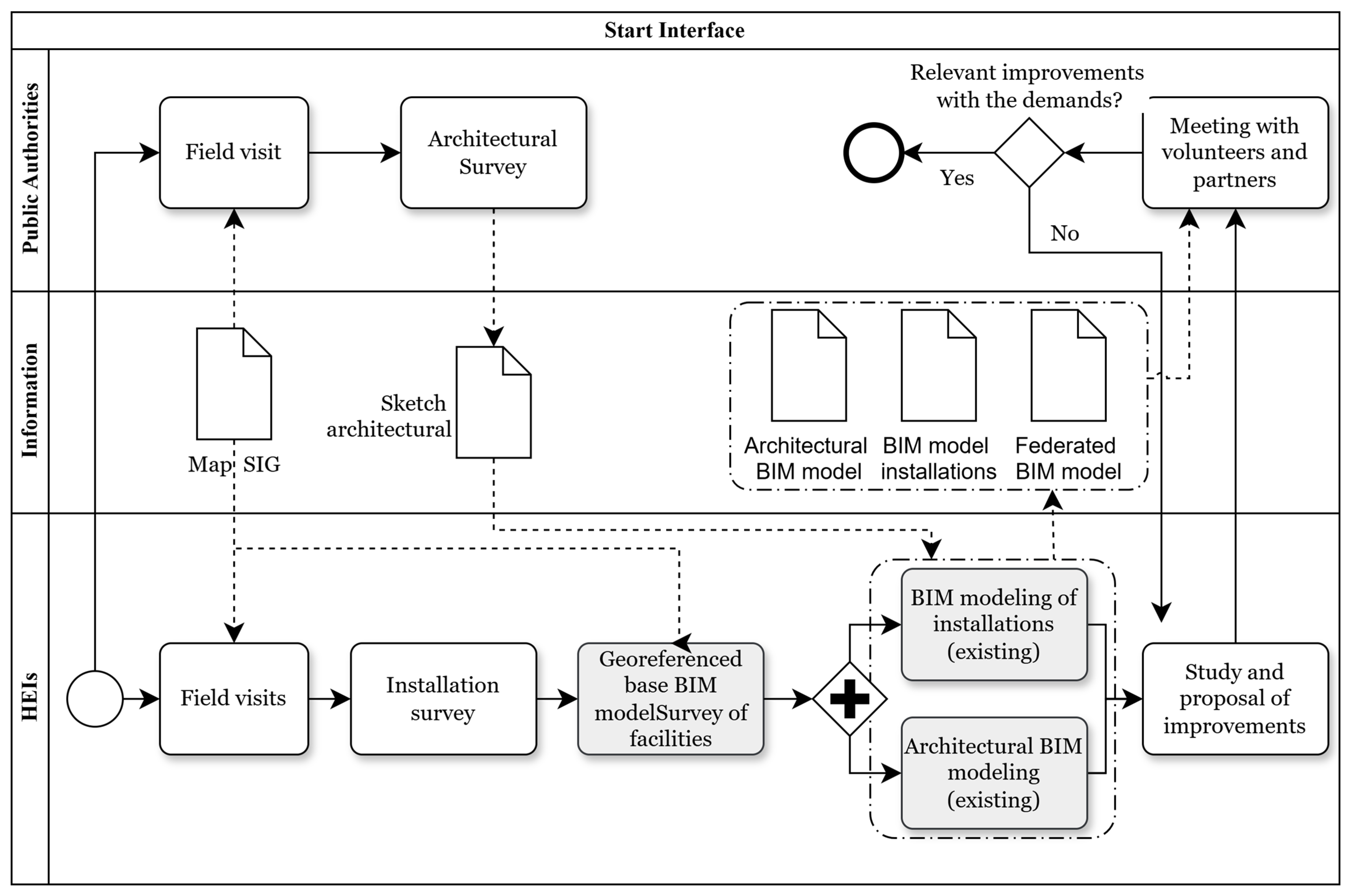 The proposed methodology employs Business Process Model and Notation (BPMN) to systematically organise BIM processes into traditional workflow. The key interfaces mapped are related to public agencies, civil society, and designers—represented in this study by Higher Education Institutions (HEIs). Through understanding the information exchange between players, this methodology aims to optimise decision-making processes. Note that the proposed workflow was tested using Brazilian context and self-built communities and may need to be adapted to other contexts.