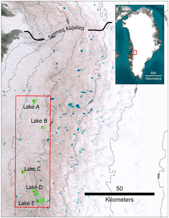 In the Sermeq Kujalleq Ablation Region (SKAR), melt-lakes form across the region and vary in size, with smaller and deeper lakes at lower elevation due to the relative steepness of the ice sheet surface and larger (area), shallower lakes at higher elevation, due to the GrIS having a gentler slope [49]. Our study area (Figure 1, red box) is a small region (70 km × 20 km) within the SKAR that includes numerous melt-lakes. Within this area, we studied five supraglacial melt-lakes over the 2021 melt season (28 May–23 August) in a narrow elevation band (~150 m) ranging from 1036 to 1185 m a.s.l. (Figure 1), which are located 45–115 km south of the glacier.