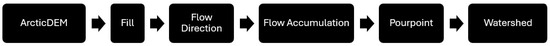 Conceptual series of steps performed in ArcGIS Pro to delineate melt-lake watersheds from the ArcticDEM elevation dataset.