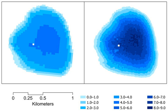 Volume estimates from our two remote sensing methods (depth-reflectance and DEM) are calculated as the product of our derived depths and the pixel’s surface area. We find general agreement in melt-lake bathymetry between these two methods in that we observe the steepest lake-bed slopes along the perimeter of our melt-lakes and the higher-depth pixels in similar locations within each melt-lake (Figure 3). Figure 3 shows melt-lake depths plotted using the depth-reflectance (left) and DEM (right) methods for Lake C for our peak melt-lake volume date, 31 July. Similar to what we see in Figure 3, a majority of our melt-lake depths over the entire melt period show mean depth (dµ) derived from the higher-resolution (2 m) DEM method having higher maximum melt-lake depths (dmax) than the Landsat-derived (30 m) depth-reflectance method (Figure 3). For additional comparison, we downscaled the high-resolution ArcticDEM to match the Landsat imagery for Lake C, that is, resampling the DEM from 2 m to 30 m resolution. We found that the downscaled volume was ~3600 m3 less than the volume derived from the original 2 m DEM, or a 0.08% difference in lake volume. Differences in maximum melt-lake depths and overall melt-lake volumes between the DEM and depth-reflectance methods are likely due to the order-of-magnitude difference in spatial resolution between the two datasets (Landsat-8 vs. ArcticDEM) such that the DEM dataset is better able to resolve small-scale undulations at the lake bottom, generating the observed higher mean and maximum melt-lake depths. Additional difference in maximum melt-lake depths is likely attributable to the depth-reflectance method’s dependence on the attenuation of light, thus affecting the Ad, R∞, and g terms in Equation (1) (see Section 5). Similar findings by Pope et al. (2016) and Melling et al. (2024) noted a plateauing effect in their depth-reflectance approaches for deeper melt-lake depths, which is likely due to the rapid absorption of light in the red band, suggesting that depth-reflectance methods are better suited to shallower melt-lakes.