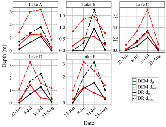 Mean (dµ, solid line) and max (dmax, dashed line) depths for our five melt-lakes plotted for the DEM-based (blue) and depth-reflectance (black) methods for the 2021 melt season.