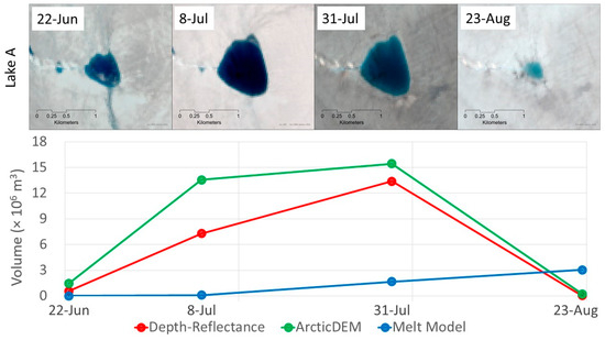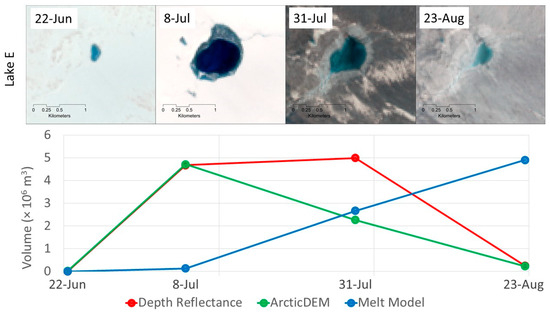 The one lake for which the ablation method was somewhat consistent with the remotely sensed methods was Lake D. By 31 July, the ablation model had generated enough melt to fill the lake at a volume nearly equal to the depth-reflectance method. However, there was still not enough melt generated by 8 July to fill the lake to the spatial extent observed in the Landsat imagery.