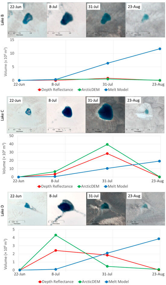 For each of the five melt-lakes, the volumes calculated through the ablation model correlated poorly to those of the other methods. Furthermore, it is clear from Landsat-8 imagery that lakes are present and of significant size despite the ablation model showing little meltwater having been generated (Figure 6). Because we are reporting the sum total of all the meltwater generated from 1 May through the time of each image date, the ablation model should serve as a theoretical maximum for the volume of water in each of our melt-lakes. While we know that there is evaporation and percolation of meltwater into the ice, this is not represented by the Tsai and Ruan (2018) model [46]. However, for four of the five lakes in this study, the ablation model shows nearly an order of magnitude less melt than either of the remote-sensing methods for 8 July. The ablation model generally shows larger lake volumes for the late-August time period, but again, because we are not accounting for sudden lake drainage via hydrofracturing, we are only able to obtain the theoretical maximum lake volume by that date. Still, the maximum lake volumes generated by late August fall far below the volumes that we calculate at maximum lake size via these other methods.