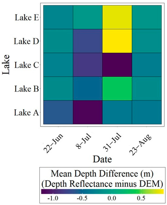 Difference in mean depth (m) between our two remotely sensed methods (depth-reflectance and DEM) for our five melt-lakes over the 2021 melt season. The color gradient represents the magnitude and direction of the difference (depth-reflectance minus DEM), with darker shades indicating larger deviation. Positive values indicate observations where depth-reflectance depths are greater than those derived from the DEM.