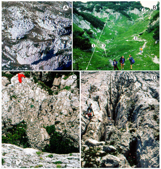 Karst features: (A). recent drawdown dolines (Maglič Mountains), (B). paleo drawdown doline with subsidence dolines (Totes Gebirge), (C). schachtdolines (Totes Gebirge), (D). giant grike (Julian-Alps). Legend: 1. interglacial giant doline, 2. floor remnant of glacier trough, 3. suffosion doline.