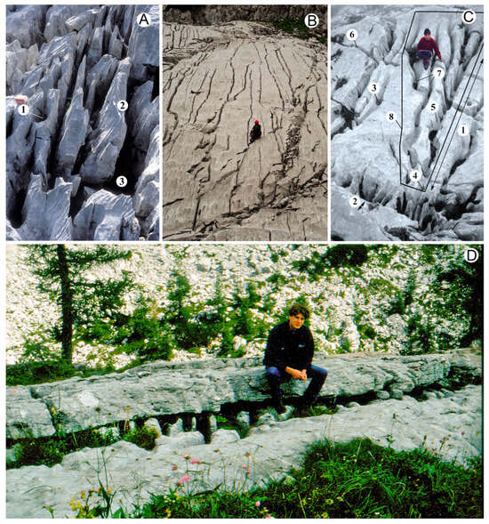 With altitude increase, karren (Figure 3), both karren of percolation origin (kamenitza, grike, Schichtfugenkarren) and of flow origin (rillenkarren, rinnenkarren, or channel, meanderkarren, wandkarren and trittkarren) are more and more dominant on bare surfaces [16,23,24]. Karren of flow origin may develop by laminar or turbulent flow [25].