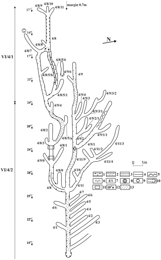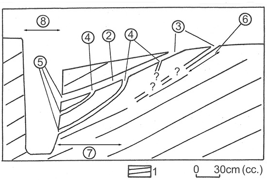 Karren cave system (Totes Gebirge) based on photos of Figure 10 [23]. Legend: 1. bedding plane, 2. through karren cave, 3. channel floor pit, 4. pit inside karren cave, 5. outlets (spring mouth), 6. karren cave that developed in the continuation of floor pit, 7. karren cave belonging to outlet, 8. giant grike. ?: probably, passage development is not continuous.