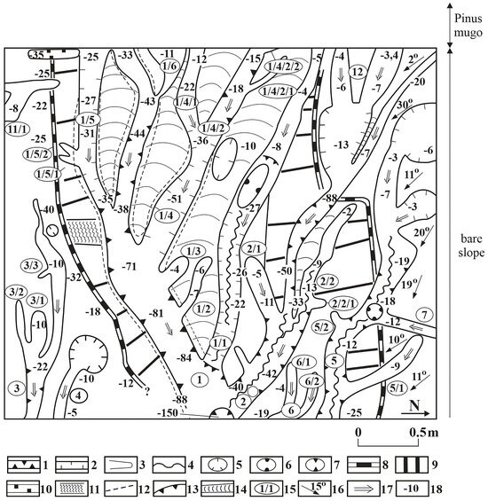Map of rinnenkarren situated below Pinus Mugo patch [36]. Legend: 1. type B main channel, 2. type B tributary channel, 3. type A channel, 4. inner, type III (channel floor) meander, 5. kamenitza, 6. floor kamenitza, 7. pit of channel end, 8. margin of basin bearing rinnenkarren, 9. side slope of basin, 10. grike, 11. semi-circular indentation, 12. overhanging wall, 13. step, 14. interchannel ridge, 15. identification code of channel, 16. slope direction and slope angle, 17. direction of channel floor inclination, 18. depth of karren feature (in cm).