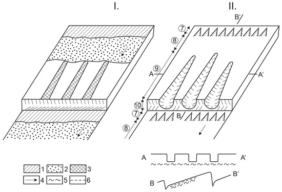 Karren belts of slope with cuestas and development of rinnenkarren. Legend: (I). state preceding karren formation, (II). slope affected by karren formation, 1. sheet water with dissolution capacity, 2. saturated sheet water, 3. rivulet, 4. slope direction and water flow, 5. saturation level, 6. piezometric level, 7. rillenkarren, 8. Ausgleichsfläche, 9. rinnenkarren, 10. pit.