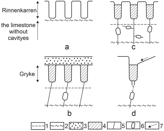 Basically, rinnenkarren floors are balance surfaces at which deepening only occurs if the duration of turbulent flow increases. Thus, the saturation level is at the floors. All this results in the fact that the cavernous part of the epikarst is absent below a surface dissected exclusively by rinnenkarren (Figure 9a). However, in the rock below the floors there is no saturated water either because rinnenkarren do not develop along fractures [23]. If there is no infiltration and cavity formation, there is no piezometric level either.