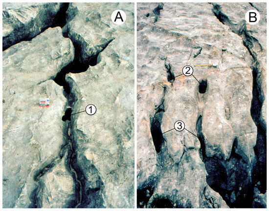 On the bare surfaces of glaciokarsts, the cavernous part of the epikarst does not develop (rillenkarren, rinnenkarren, grike); if it does, it is only formed in small expansion and it is underdeveloped (pit). The epikarst cavities of glaciokarst that were exposed by glacial erosion are paleoepikarsts and they did not develop in bare surface environment. Although recent cavity formation may rarely occur, it is due to the fact that to the effect of a specific circumstance, karren formation was placed below the surface, on the bedding plane that separates the beds [23]. Limited cavity formation may develop in the rock, along the bedding plane where rinnenkarren is formed (Figure 3D), or in karren caves (Figure 10 and Figure 11). In the beginning, at percolation by laminar flow, and then more and more by turbulent flow. However, at these sites, the karren caves open onto the surface (Figure 12) and do not take part in the development of the cavernous part of the epikarst. Below the floor of rinnenkarren, the degree of cavity formation increases if there are many pits on the floor (Figure 13). However, the above-mentioned processes and their related features are rare.