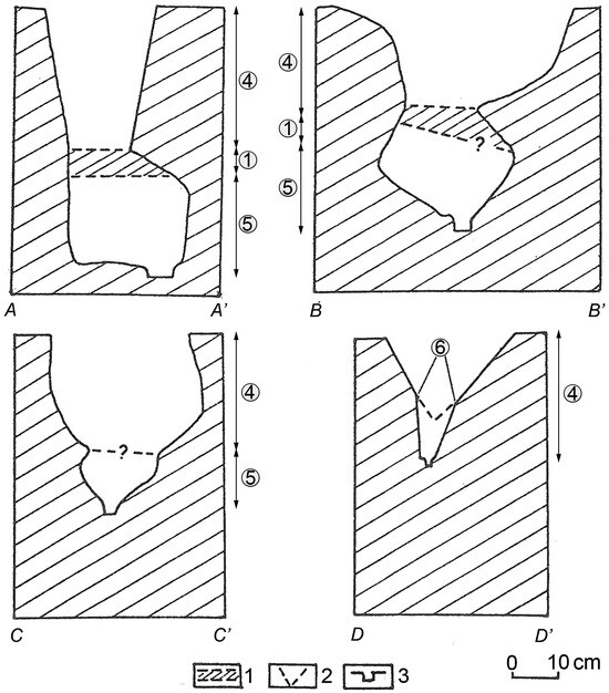 Coalescence of rinnenkarren and karren cave [23]. Legend: 1. former ceiling, 2. previous, now missing part of surface channel part, 3. inner, floor rinnenkarren, 4. channel part that developed by the deepening of the rinnenkarren, 5. channel part that developed by dissolution below surface, the profiles were made from different parts of a rinnenkarren that developed by coalescence: between profiles A–A’ and B–B’ coalescence took place by the collapse of the ceiling of a former karren cave, at profile C–C’ the rinnenkarren dissolved through the ceiling of the karren cave, between profiles C-–C’ and D–D’ a channel floor pit developed from which the karren cave was formed.