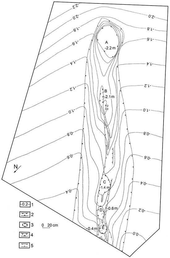 Pits of a large rinnenkarren (Totes Gebirge) [23]. Legend: 1. contour line, 2. margin of large channel, 3. valley floor pit, 4. inner, floor channel, 5. further inner floor channel of a floor channel.