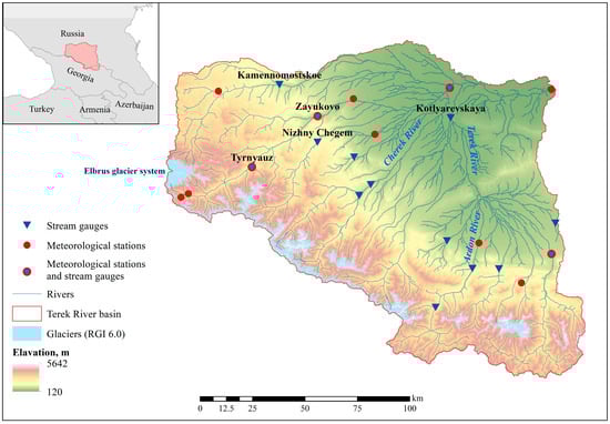 A typical example of a river that can serve as a case study for studying the effects of climate change on hydrological processes is the Terek River. The upper part of its basin includes glaciers from the Greater Caucasus, where these processes can be observed most clearly. The North Caucasus is one of the most densely populated and agriculturally developed regions of the Russian Federation. During low-water periods, the water supply of the region mainly depends on high-altitude areas, and may be insufficient during dry seasons [18].