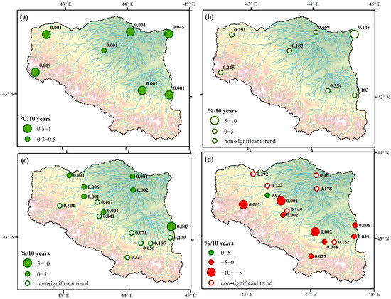Trends (Student’s t test p values at the 5% significance level) in average annual temperature (a) and annual precipitation (b), according to actual data from meteorological stations (1977–2014) and average annual (c) and maximum (d) annual discharges, according to actual data from hydrological gauges in the Terek River Basin (1977–2018).