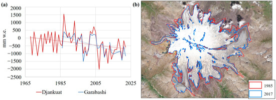Mass balance dynamics of representative glaciers (Djankuat [38] and Garabashi [39]) within the study area (a), and change in the area of glaciation of the Elbrus glacier system (b), satellite image Sentinel-2 30 August 2022 (contours of the glaciers of Elbrus in 1985 and 2017 provided by the Institute of Geography of the Russian Academy of Sciences).
