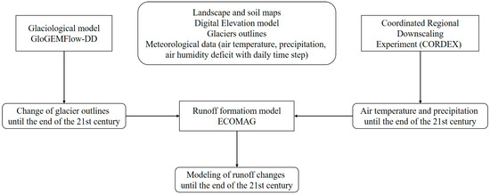The assessment of probable changes in the flow of the Terek River in the 21st century, taking into account climate changes and glaciation in the basin, was carried out on the basis of a set of hydrometeorological models. A framework of the assimilation of climatic and glaciological modeling data and the ECOMAG runoff formation model is shown in Figure 4. To account for climate change and deglaciation, the input data for the ECOMAG model include calculated changes in glaciation areas (based on the global glaciological model GloGEMflow-DD) and regional climate changes (data from the CORDEX project) (Table 1).