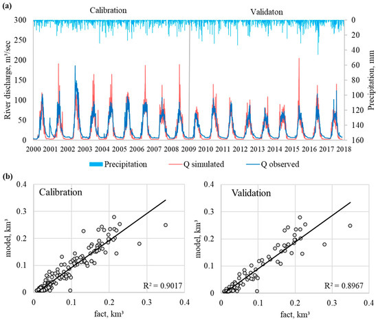 Model performance at the Tyrnyauz gauge during the calibration (2000–2008) and validation (2009–2018) periods (a); scatter plots of the observed and simulated monthly flow volumes at the gauge during the calibration period and validation period (b).