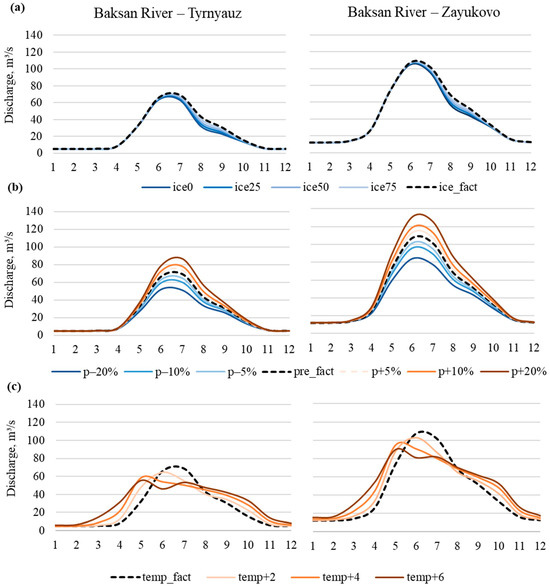 The change in glaciation mainly affects discharges in July–October, because this is the period of intensive melting of glaciers that are already exposed to snow (Figure 6a). The greatest impact of glaciation is observed in August and September. For example, under the ice50 scenario, the average monthly discharge of the Baksan River decreased by −13% and −9% in August and by −12% and −8% in September, according to the Tyrnyauz and Zayukovo gauges, respectively. In the absence of glaciation (ice0 scenario), runoff from August to September decreases on average by −25% and −16%, according to the Tyrnyauz and Zayukovo gauges, respectively.
