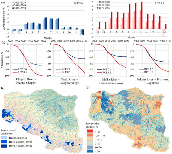 Predicted changes in the Terek River basin: (a) average monthly air temperature, (b) glaciation area, (c) snow line position (snow-covered catchments as of 1 September) and (d) average precipitation for 2070–2099 in the RCP8.5 scenario, relative to the base historical period for elementary catchments.