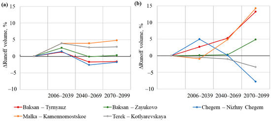 Runoff volume anomalies (%) under the climatic scenarios RCP2.6 (a) and RCP8.5 (b) relative to the base historical period for various gauges in the high-altitude part of the Terek River basin.