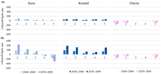 By the last third of the 21st century, under the RCP2.6 scenario, minor changes in annual snow and rainfall runoff (up to 70–80 mm) are anticipated (Figure 9a). However, in the context of rising temperatures and accelerated glacier degradation, annual glacial runoff is expected to decrease significantly, ranging from 150 to 400 mm. This degradation of glaciers will play the most critical role, leading to reduced runoff in the high-altitude areas of the Baksan River (Tyrnyauz) and Chegem River (Nizhny Chegem) basins. Nonetheless, an underlying increase in precipitation is projected to increase flow in larger basins that have a greater proportion of rainfall runoff.