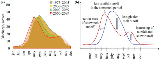 One more limitation of the current modeling framework is the lack of explicit consideration of the probability and potential impact of extreme hydrometeorological events, such as heavy precipitation or glacial lake outburst floods (GLOFs). This becomes particularly relevant under the RCP8.5 scenario, which projects an intensification of autumn rainfall that could trigger such hazards. Coupling runoff formation models with hydrodynamic models has become a common practice in hydrological forecasting [77,78]. A similar methodology was previously applied by Kornilova et al. [79], where a glacial lake outburst scenario from Lake Bashkara and its downstream impact on the Baksan River under present and future climatic conditions were simulated. Future research should focus on embedding modules capable of estimating the likelihood and intensity of extreme events, particularly flash floods, GLOFs, and debris flows, into the model structure. Special attention must be given to the autumn period (September–November), when increasing liquid precipitation and the melting of persistent snow cover are expected to increase hydrological risk.
