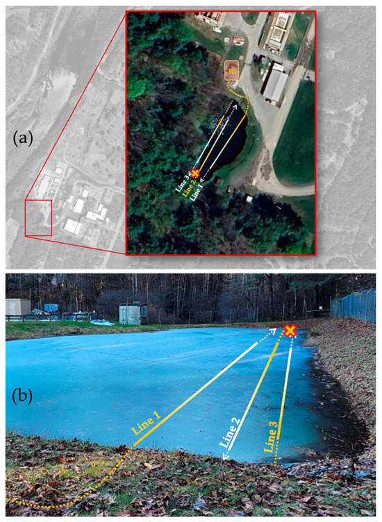 (a) Aerial view of the CRREL pond indicating cable layout. Airbus Imagery from the date: 5 July 2024. (b) Photo of the study site (CRREL campus, Hanover, NH, USA) with approximate locations of the fiber optic cable lengths considered in this analysis. The “X” marker represents the location of the ice strikes at the south end of the pond. For scale, the pond is 55 m north to south and 30 m east to west.