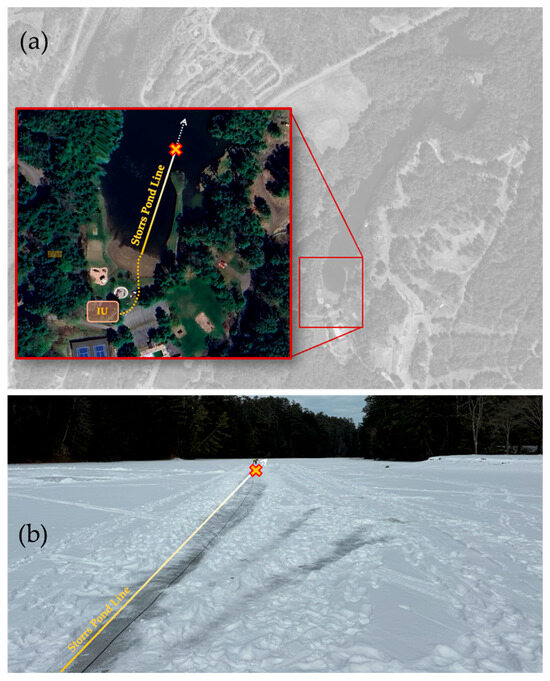(a) Aerial view of Storrs Pond showing cable layout. Airbus Imagery from the date: 5 July 2024. (b) Photo of the study site (Storrs Pond, Hanover, NH, USA) with approximate location of the fiber optic cable length considered in this analysis. The “X” marker represents the location of the impacts.