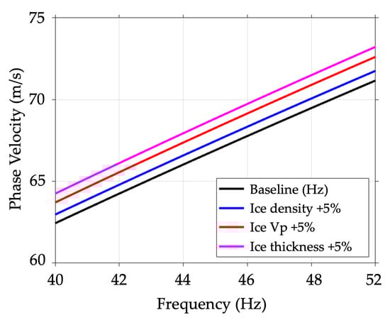 Sensitivity of the flexural wave phase velocities as given by our forward model. The “baseline” model corresponds to our 5 cm ice thickness model described in the text. For each perturbation, the parameter was varied by 5%.