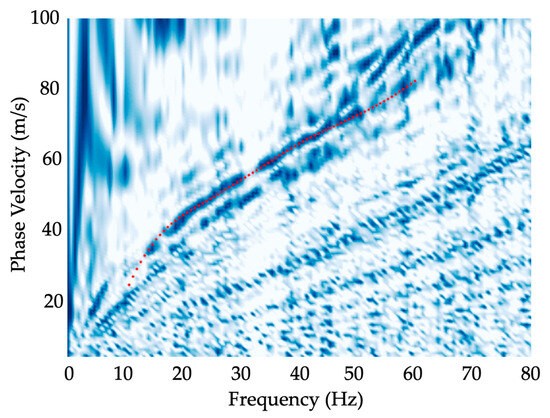 The phase velocities of the flexural waves were measured using a phase velocity transformation. Within this methodology, the phase velocity which gives the highest-power beamformed output is selected as a function of frequency; refer to Park et al. [12] for more details. An example of the calculations along Line 1 is shown in Figure 6. While coherent noise appears present at many frequencies, a clear amplitude peak showing increasing phase velocity with increasing frequency can be observed. This trend is typical of flexural waves, though an inverse trend is typical of Rayleigh waves in the solid Earth with increasing seismic velocities with depth [22].