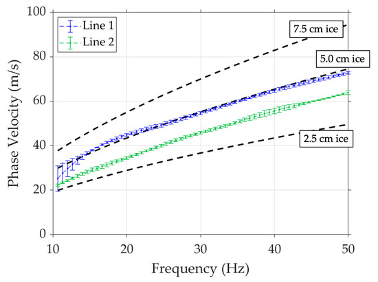 Phase velocity as a function of frequency for Line 1 (blue) and Line 2 (green). Modeled phase velocities corresponding to 2.5 cm, 5 cm, and 7.5 cm of ice are shown in the dashed lines.