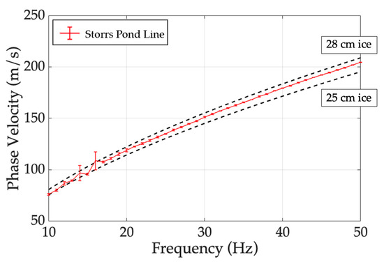 Phase velocity as a function of frequency for the Storrs Pond line (red). Modeled phase velocities corresponding to 25 cm and 28 cm of ice are shown in the dashed lines.