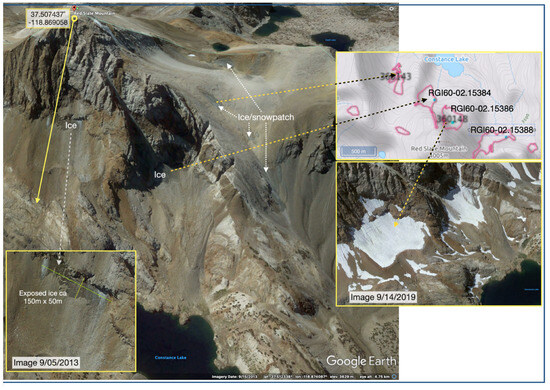 Some of these difficulties in observation, mapping, and recording can be seen in Figure 1. This shows small glacier extents being covered by debris on the slopes of Red Mountain in Sierra Nevada, CA, as noted by Millar and Westfall [13]; for further discussion, please refer to [14]. The decimal latitude–longitude [dLL] geolocation (to four decimals) of Red Mountain is [37.5074,-18.8690]. A similar situation of glacier disappearance and designation in the RGI is presented in the work of Whalley [15] in relation to the Spanish Pyrenees.
