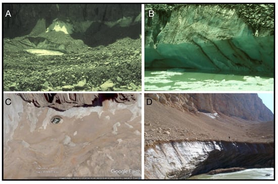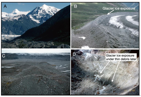 A similar example from the Taurus Mountains in Turkey [98] is also shown, with massive glacier ice exposures below relatively thin (<1 m) debris cover in Figure 10C,D. With glacier ice, large quantities of water, and substantial ice cliffs, there is little doubt that the ice is at the pressure melting point and is not ‘permafrost’. GE examination in both these areas show a wide variety of topographic forms relating to moraines, remnant glaciers, and rock glaciers (see also Figure 1). The National Creek RG (Figure 4) might become, with long-term monitoring, similar to the exposures in Figure 10.
