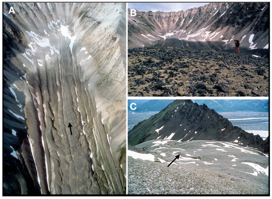 Small rock glaciers have also started to form subsequent to the re-establishment of a glacier within the crater of Mt St Helens [89]—Loowit Glacier GLd[46.2135,-122.1854] and Leschi glacier RG[46.2078,-122.1832]. In time, it will be interesting to monitor the formation of rock glaciers where substantial rockfalls have covered parts of the glaciers [89] (see Figure 9C). Deline et al. [90] in a brief mention of ‘reduced ablation due to rock avalanche deposits’ illustrate this notion with an illustration of the Black Rapids Glacier in Alaska, where a 2-m-thick surface debris from a 2002 rock avalanche has protected the ice to give a 15-m-high platform above the glacier’s ablation zone. This is similar to the effects of a rock avalanche on the Sherman glacier, Alaska, as examined by Bull and Marangunic [91], who concluded that: if the debris sheet were to remain equally effective in preventing the ablation of the underlying ice in the years ahead, and other factors remained unchanged, the Sherman Glacier could expand by more than 1 km before the ablation zone is of sufficient area to allow equilibrium to be re-established. Such an advance would contrast with the slow retreat of the snout that has continued since about 1930.