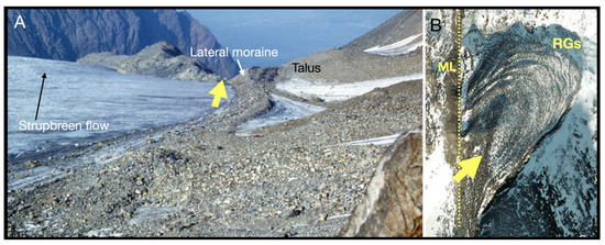 The RG from the right lateral of the Weissmies glacier ML [46.1412,8.0352] described by Messerli and Zurbuchen [81] and attributed to a permafrost origin is very similar to that at Strupbreen (Figure 5B).